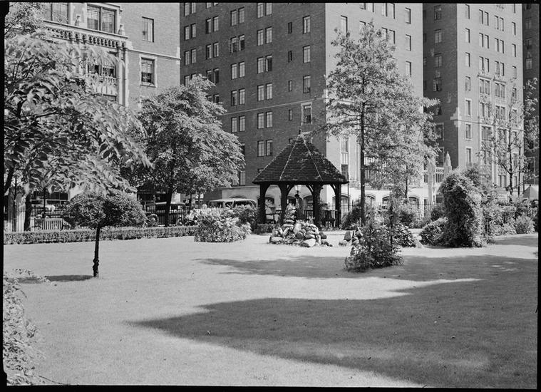 East 41st Street and Tudor City Place. Tudor City. Garden gateway and fountain