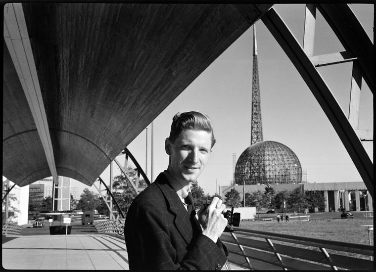 [Richard Wurts documenting the construction of the New York World's Fair site, with the frames of the Trylon and Perisphere in the background.]
