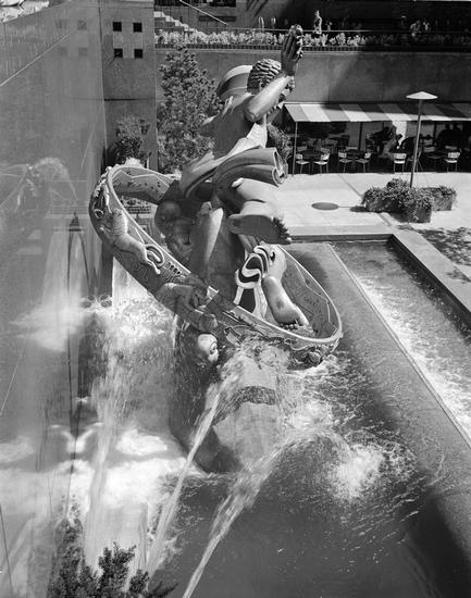 [Rockefeller Plaza. Two men in front of the Prometheus fountain in Rockefeller Center.]
