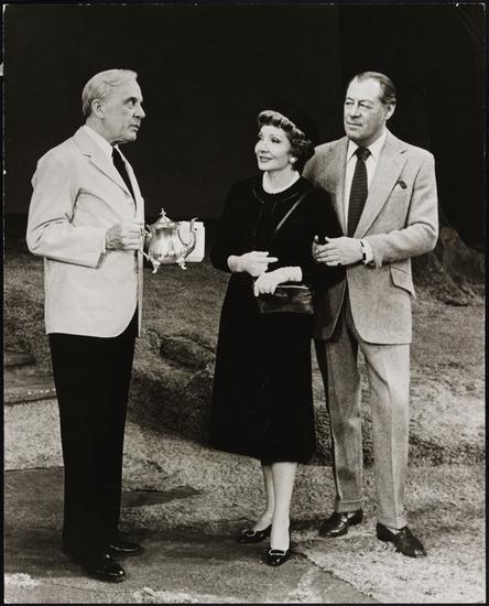 [Rex Harrison as Cecil, George Rose as Hawkins and Claudette Colbert as Evelyn in "The Kingfisher".]