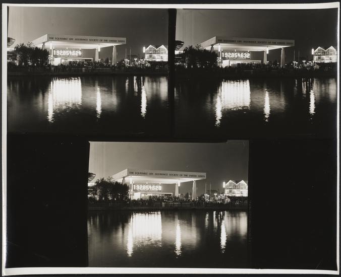 New York World's Fair. Equitable Life Assurance Building. 4 night views with population counter