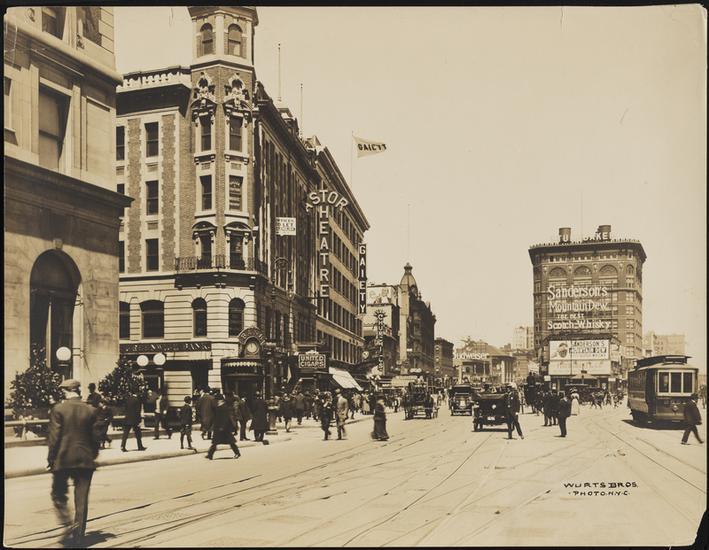 Longacre Square. Street view looking southwest at Gaiety Theater and Fulton & Churchill's, about 1907
