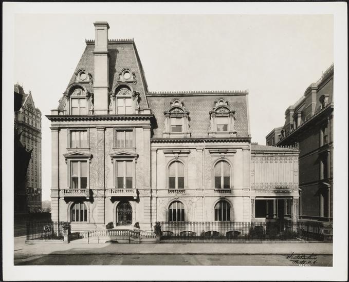 57th Street and Fifth Avenue. Residence: Built 1868 for Mary Mason Jones; Later occupied by Mrs. Parish Stevens, then H. Oelrichs, now an office building