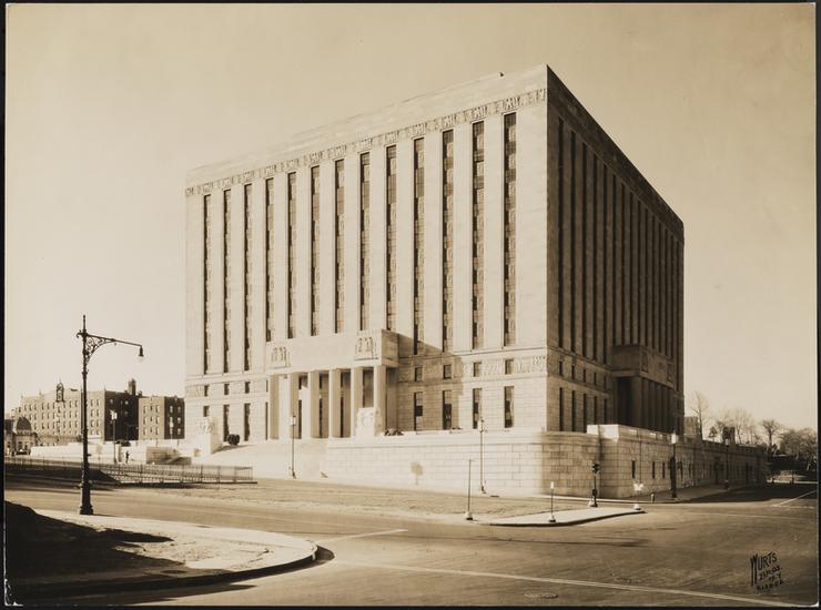 851 Grand Concourse. Bronx County Courthouse. Detail of west corner of building