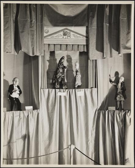 Group of view at Cooper Union Museum, puppets and marionettes on exhibition; close-ups of puppets; shadow pictures, etc.; general views of groups