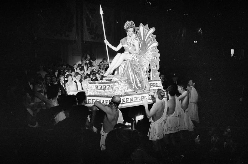 Art Students League Ball [Women with a model of a bull, a woman in a swan costume and Deborah Kerr entering the party on litters.]