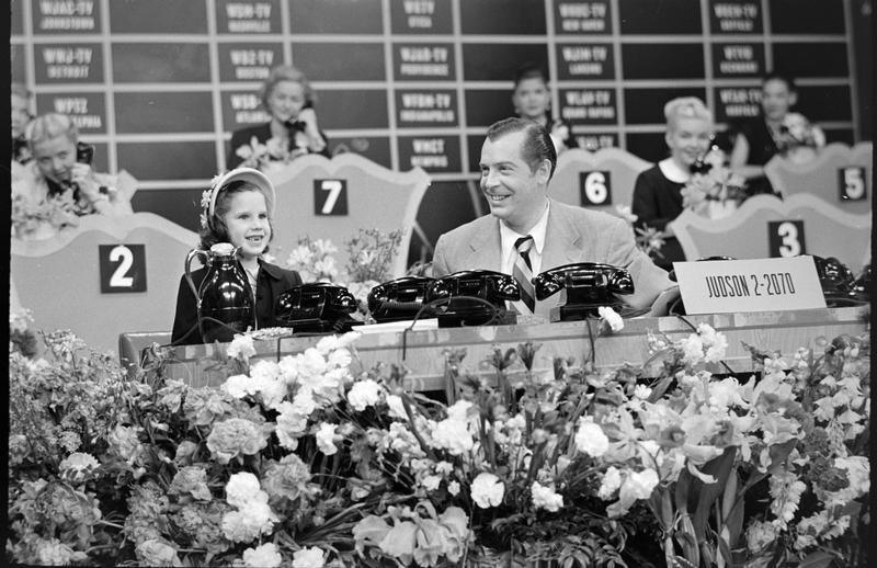 Milton Berle - Damon Runyon Cancer Fund [Girl on stage with Milton Berle and another man at the telethon.]