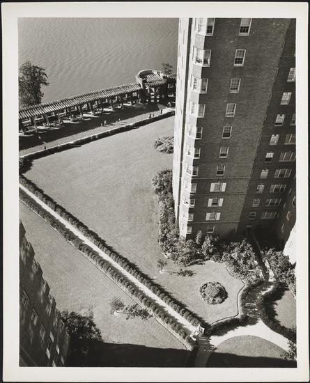 Cabrini Boulevard. Castle Village apartments, views looking down on pergola and gardens.