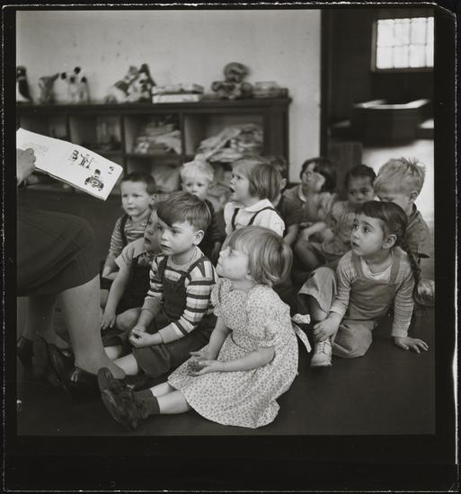 Orphanage [Boy pointing to the book as children listen to a woman read a story.]