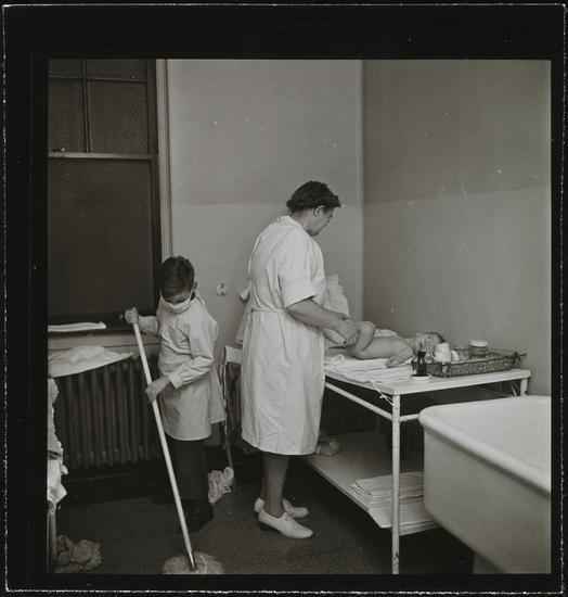 Orphanage [Nurse changing a diaper while a boy sweeps.]