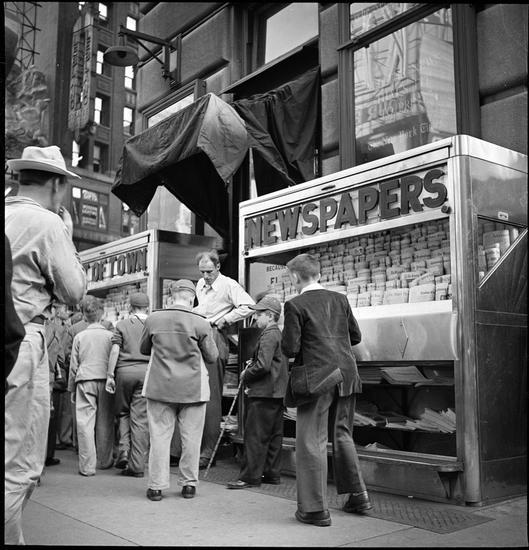 All Around the Town - Miscellaneous New York City Scenes [People browsing out of town newspapers at a 42nd Street newspaper stand.]