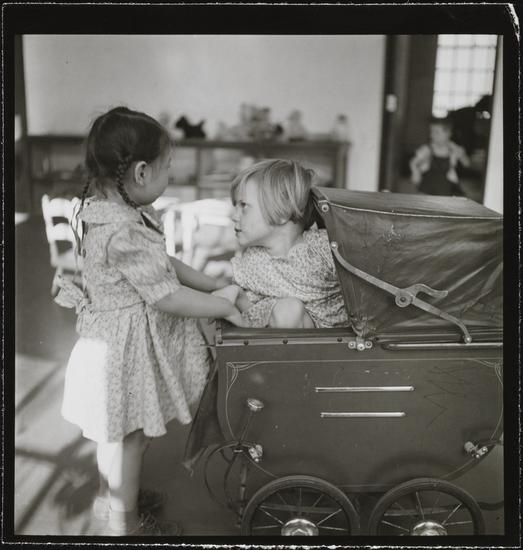 Orphanage [Girl sitting in an overturned baby carriage talking to a girl holding a stuffed animal.]