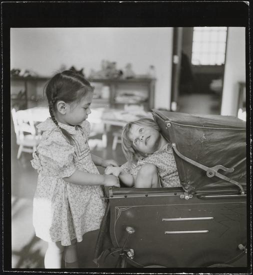 Orphanage [Girl sitting in an overturned baby carriage talking to a girl holding a stuffed animal.]