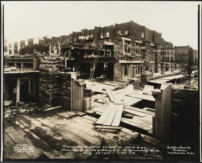 Abyssinian Baptist Church W. 138 St. N.Y.C. Looking S.E. along 138 St. front, showing high & low scaffolds