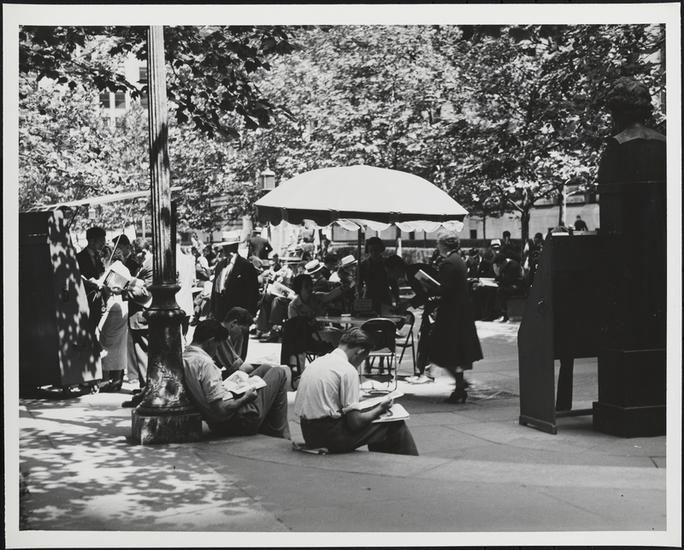 6th Avenue between 41st and 42nd Street. Bryant Park outdoor library, New York Public Library, people reading in the park.