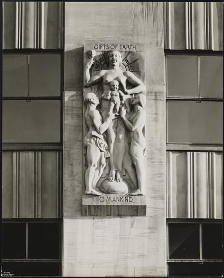 ["Gifts of Earth to Mankind" and "The Spirit of Progress" limestone panels by Gaston Lachaise on the entrance pier of the RCA Building West.]