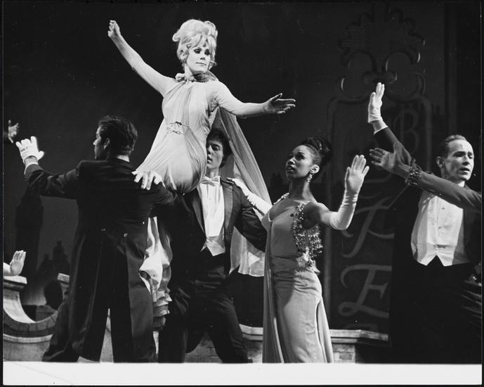 [Tammy Grimes as Elvira, Beatrice Lillie as Madame Arcati, and Edward Woodward as Charles Condomine in "High Spirits".]