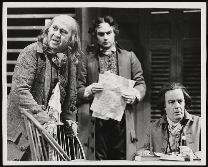 [Unidentified actor in the role of Thomas Jefferson, Howard Da Silva as Benjamin Franklin and William Daniels as John Adams in "1776".]