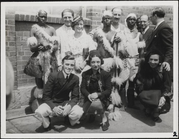 [Seymour Rexite and Molly Picon with a group of unidentified people.]