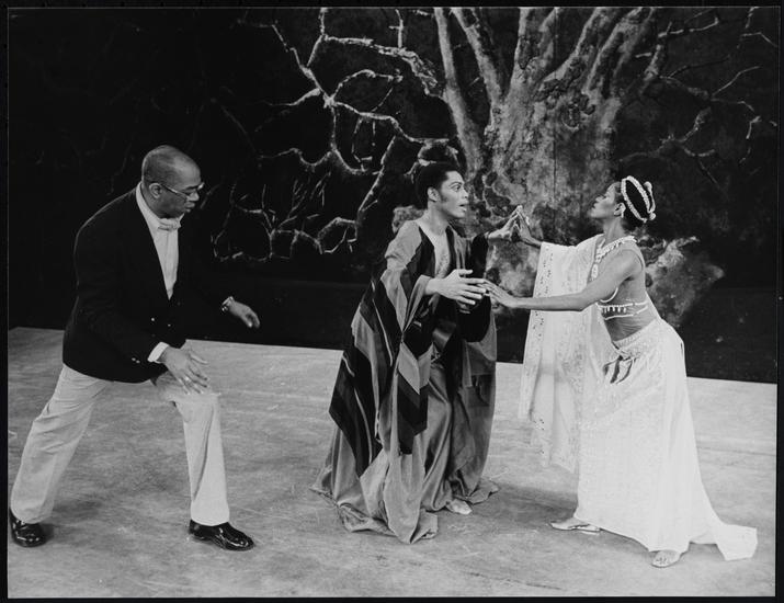 [William Marshall as Hadji, Gilbert Price as The Mansa of Mali and Melba Moore as Marsinah in "Timbuktu!".]