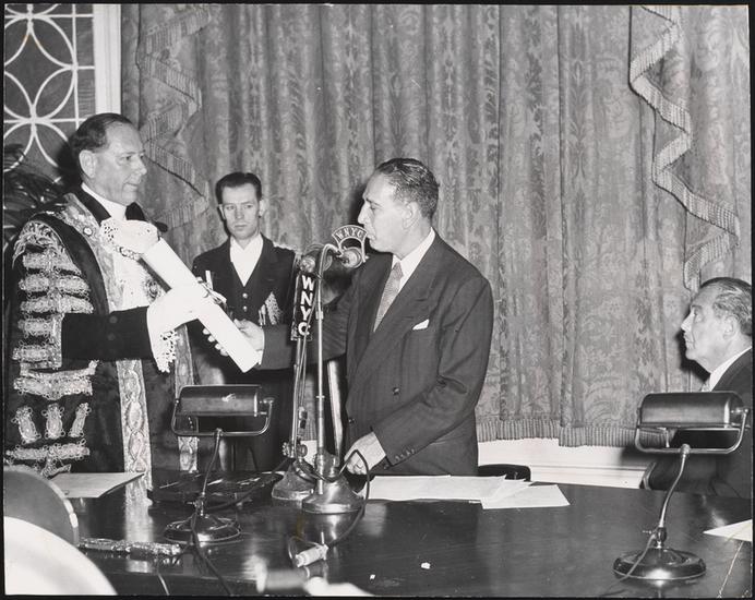 [Mayor Jimmy Walker awarding an unidentified man a medal.]