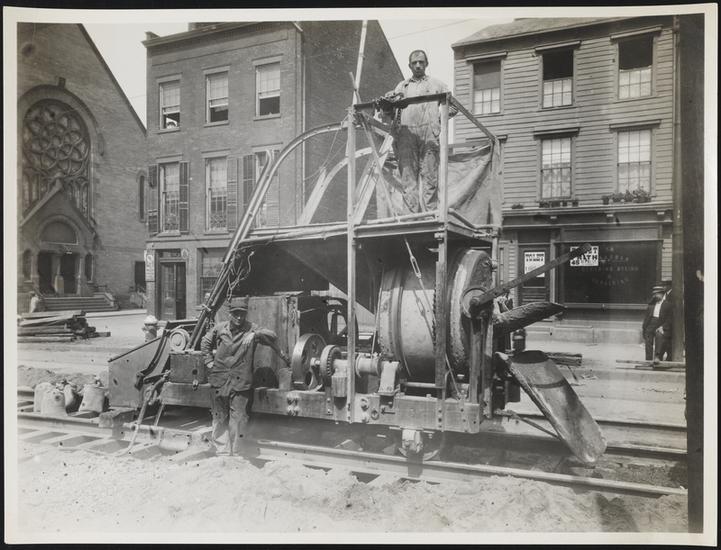 Construction of the cable road on Broadway, 1891 [Men standing on tracks.]