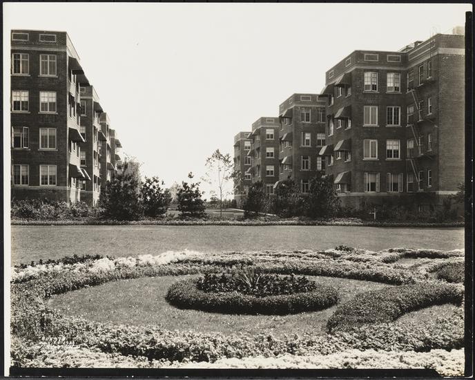 [Hawthorne Court. Apartment buildings and garden.]
