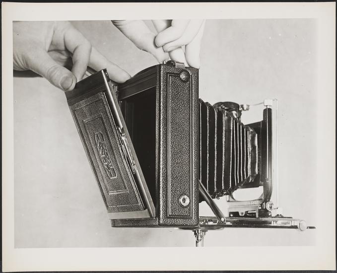 [Close-up view of newsreel camera.]