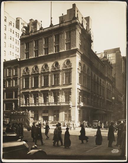 5th Avenue and 44th Street. Delmonico's, restaurant and showrooms. [Signs out front advertise exhibit of Jackson Heights apartments.]