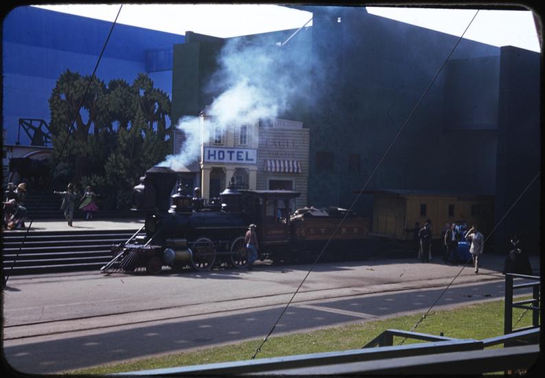 [Actors by a train during the Parade of Railroads show.]