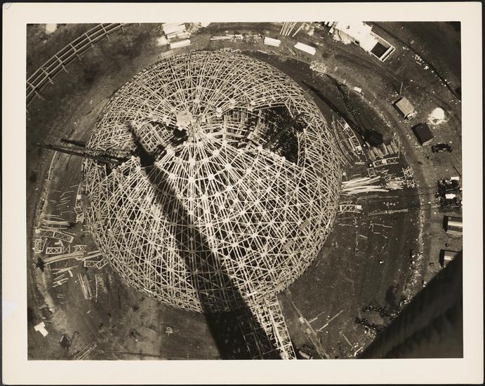 [Construction of the Perisphere with shadow of Trylon visible, New York World's Fair site.]
