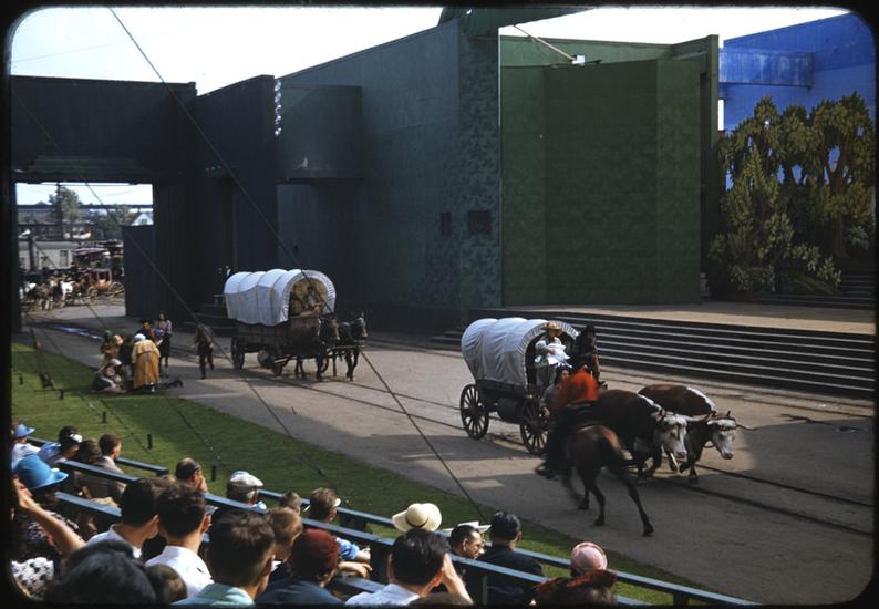 [Actors in Conestoga wagons during the Parade of Railroads show.]