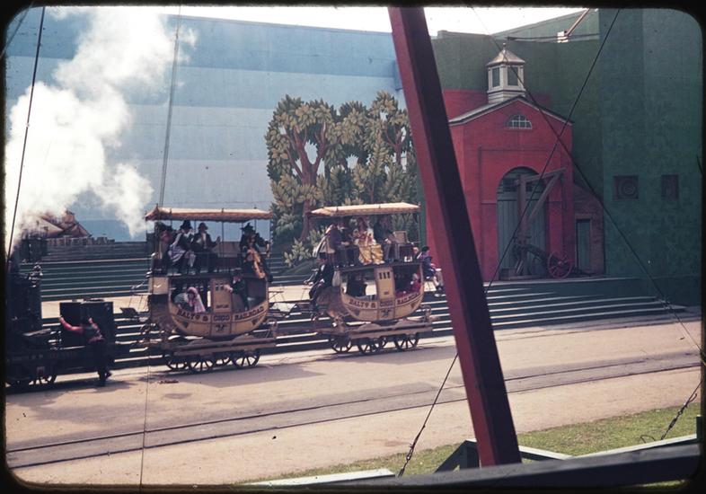 [Actors in period costumes by carriages in the Railroads on Parade show.]
