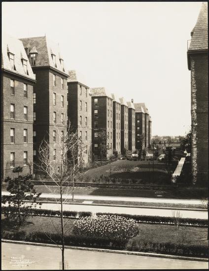 Tower Apartments. Garden centerpiece and gateway with griffins