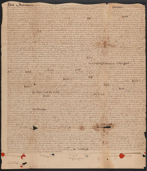 Indenture between Johannis Hardenbergh, Johannes William Smith, Albert Boom and Tounis Hough and Baron Lighthart, and Richard Bradley of New York City, April 8, 173a7