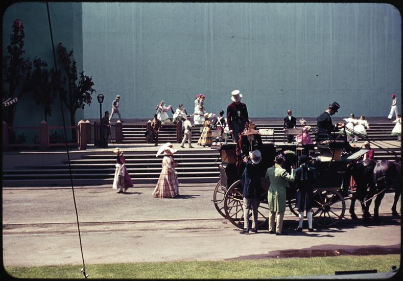 [Actors in a scene of the Parade of Railroads show.]
