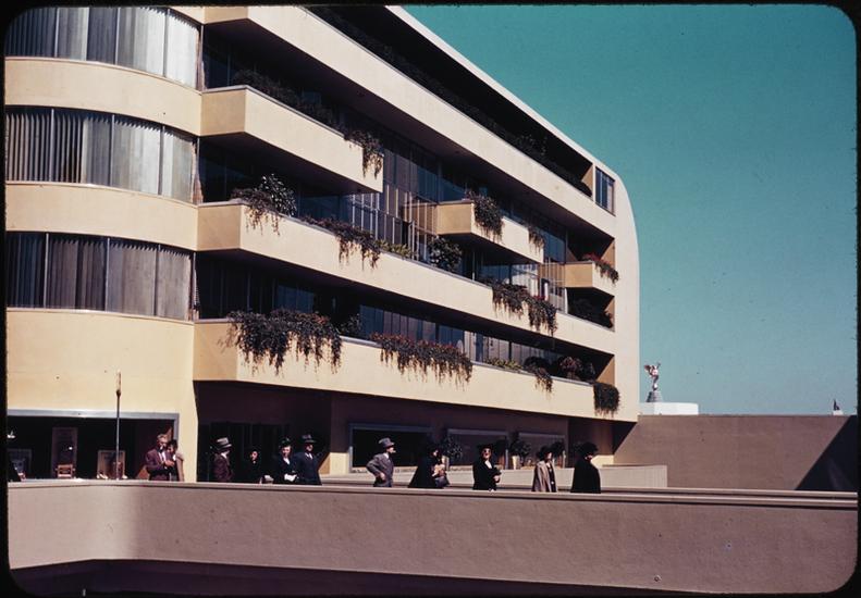 [Petroleum Industries Buidling with a model of an oil derrick.]