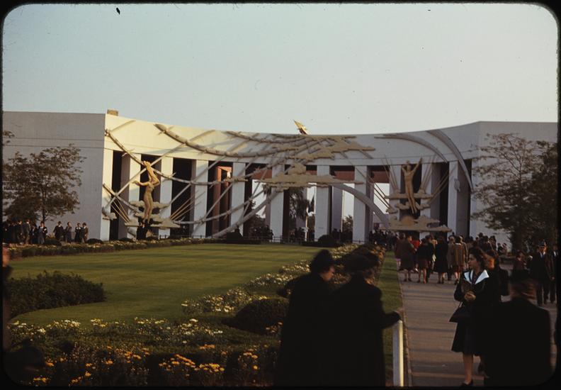 [The "Fountain of Atoms" and "American Womanhood" statue in front of the Home Furnishing Building.]