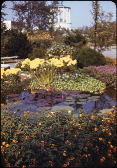 [View of a garden with a Swedish flag and the Trylon visible.]