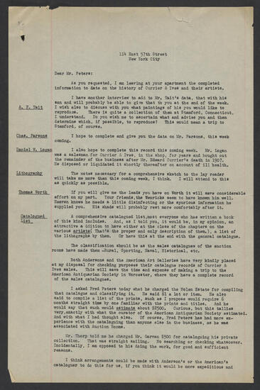 Research by Harriet Endicott Waite for the checklist to "Currier & Ives: Printmakers to the American People", submitted to Harry T. Peters, July 27, 1927