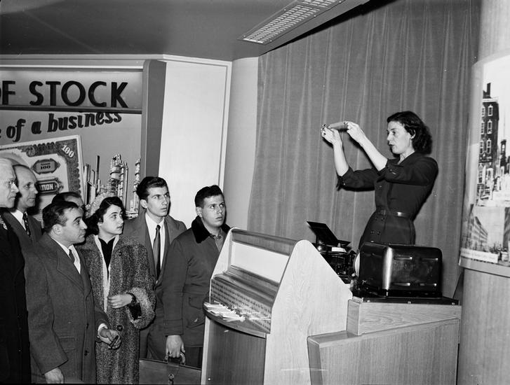 Stock Exchange [Woman giving a tour of the stock exchange, showing a model trading post.]