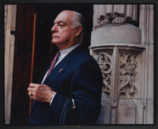 Stately older man in navy suit and maroon tie with red pin on lapel in front of ornate building. Artist's description: man in front of church on Fifth Ave.
