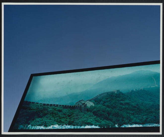 Large color image of the Great Wall of China on blue wall (or sky?). Artist's description: billboard of China wall.