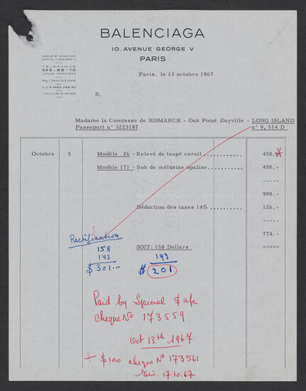Invoice from Balenciaga issued to Mrs. Harrison Williams, October 5, 1967
