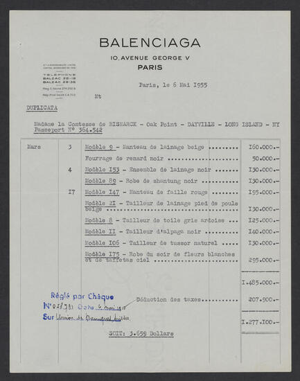 Invoice for 167.700 from Balenciaga issued to Mrs. Harrison Williams, May 23, 1955