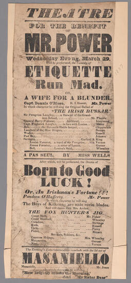 Ticket night, on which occasion Mrs. Fitzwilliam has kindly consented to appear. Wednesday evening, February 12, 1840, will be performed the comedy of "The Soldier's Daughter"