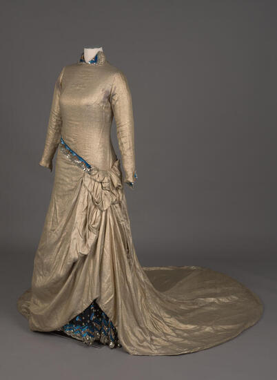 Concert gown of emerald green silk taffeta with black and jet embroidery