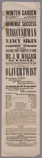 Thursday evening, March 7, 1861, will be presented "Oliver Twist", commencing with the second act, which will embrace the whole of Miss Cushman's great impersonation of Nancy Sikes