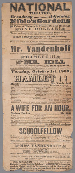 National Theatre, Broadway, adjoining Niblo's Gardens. On Thursday, October 3, 1839, will be acted Shakespeare's tragedy of "Hamlet"