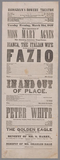 Brougham's Bowery Theatre. Sun burst of the legitimate. Tuesday evening, October 21, 1856, the performances will commence with Kotzebue's great play of "The Stranger"